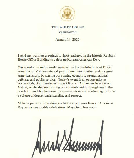 트럼프 대통령은 이어 "한인들은 우리의 타오르는 경제를 강화하고 강력한 국방과 공공서비스에 기여해왔다"면서 "오늘 행사는 미주 한인이 우리나라에 지닌 영향력을 인정하는 동시에 두 나라 간 유대·우정을 강화하며 깊은 이해와 존경을 돈독히 하는 계기"라고 말했다.
